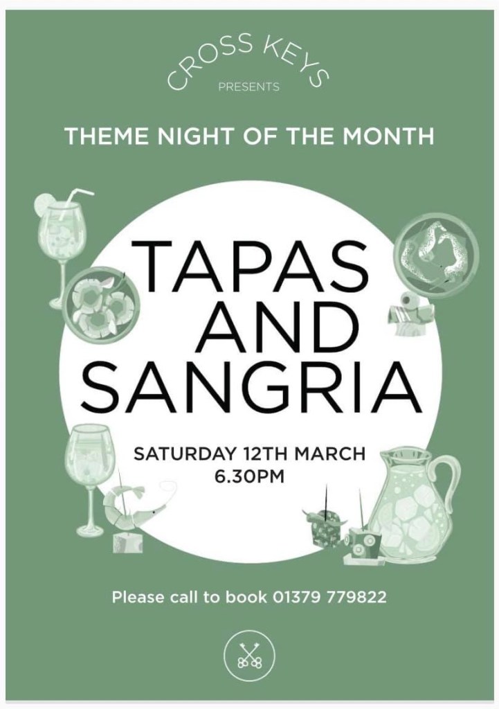 Let’s party this Saturday Posted bystephenlarderMarch 8, 2022Posted inUncategorized Tapas and Sangria at The Cross Keys! Share this: Click to share on Facebook (Opens in new window) Facebook Click to share on WhatsApp (Opens in new window) WhatsApp Click to email a link to a friend (Opens in new window) Email Like Loading...