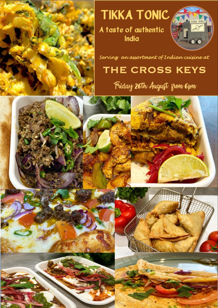 Tikka Tonic will visit The Crosskeys from 6pm on Friday 26th August as part of our ‘Street Food’ provision of food, whilst we wait for the pub to re-open under its new owners. The bar will, of course, be open. New opening times are shown below.