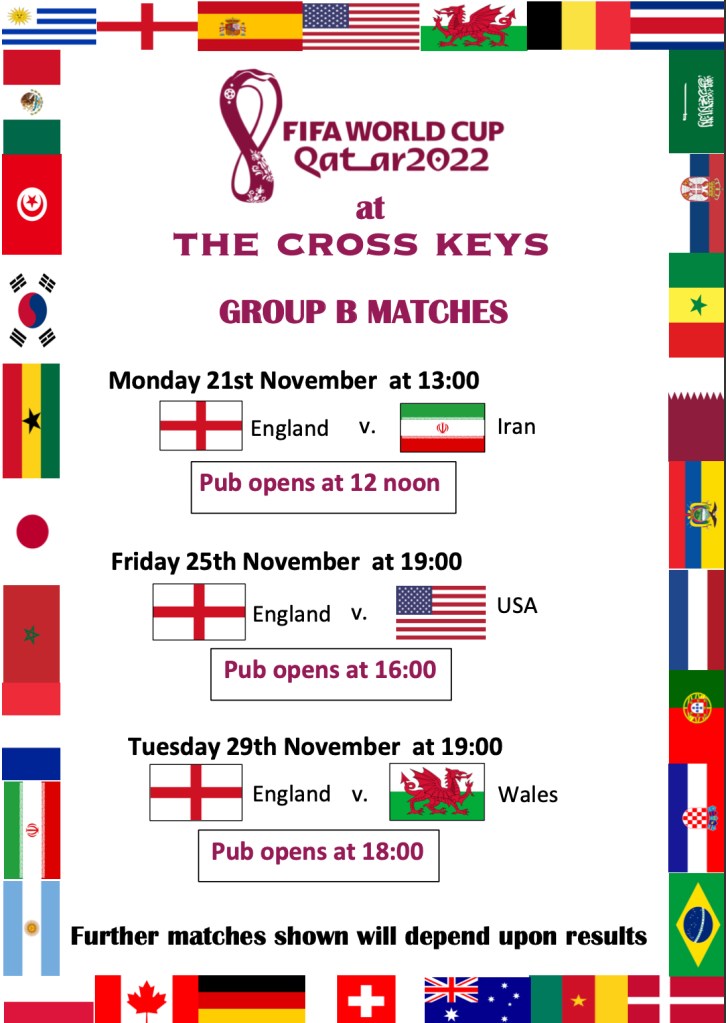 The Cross Keys will be showing the England group matches starting with those below. There will also be a sweepstake to try your luck with. Hopefully we will win these matches and we will go on to show England as we make our way through the competition!!